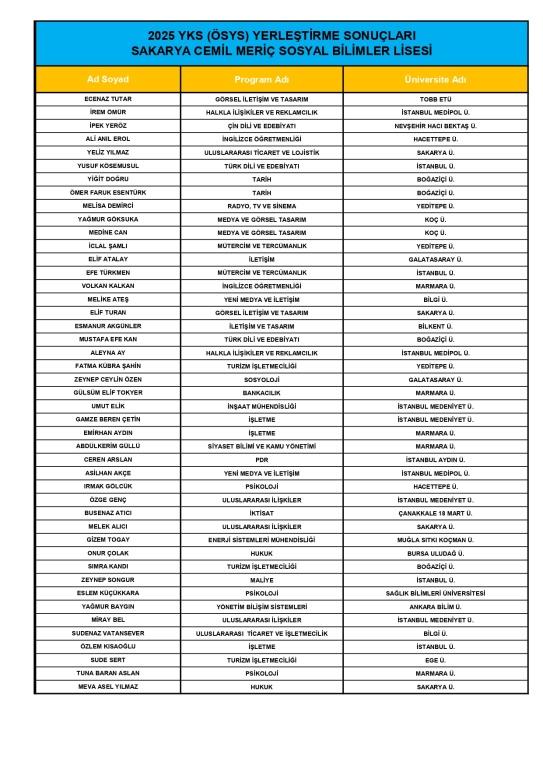 YKS 2025'e göre, üniversiteye yerleşen öğrencilerimizi gururla takdim ediyoruz. Sakarya Cemil Meriç Sosyal Bilimler Lisesi olarak öğrencilerimizi, ailelerini ve emeği geçen tüm öğretmenlerimizi tebrik ediyor, öğrencilerimize üniversite hayatında başarılar diliyoruz.